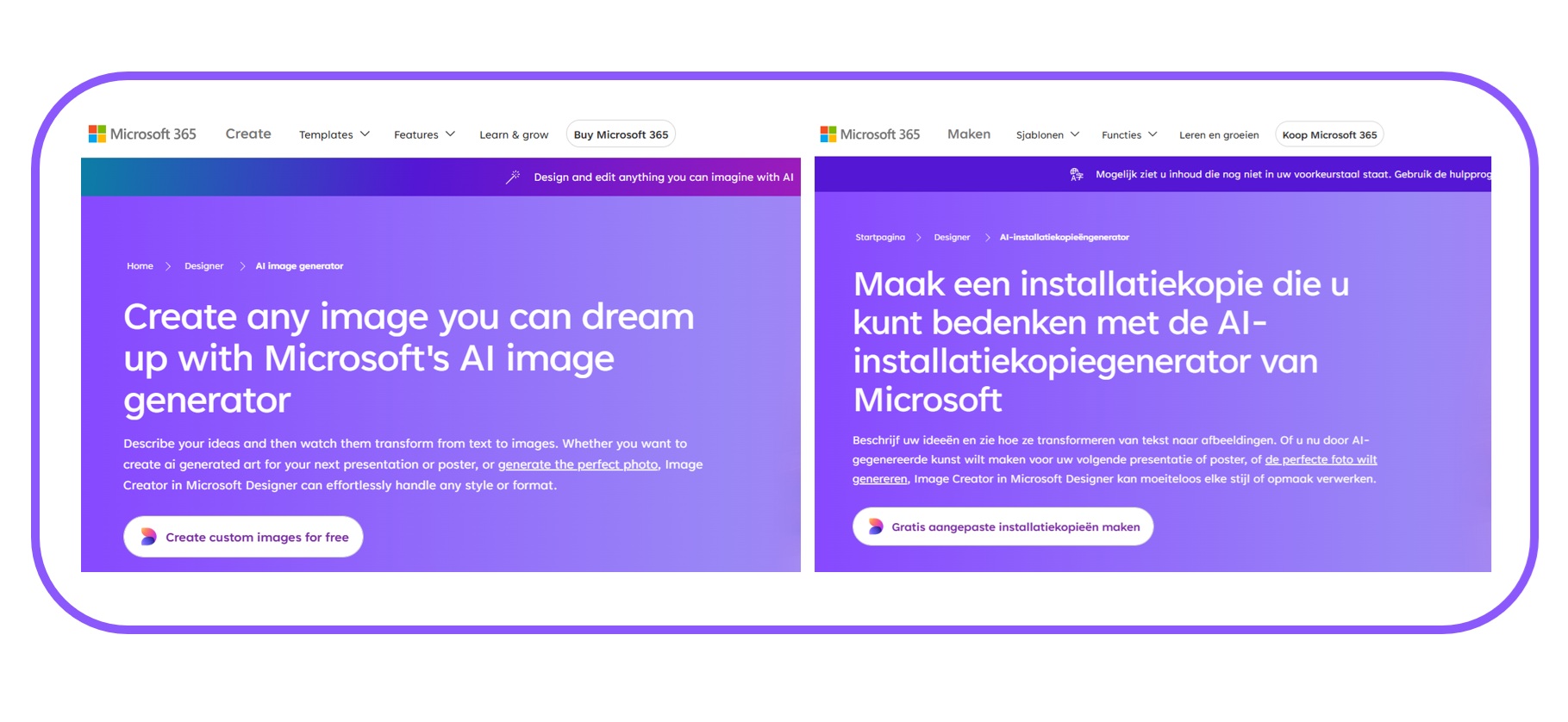 A clear example is this web page for their product ‘Microsoft Designer’, which I stumbled upon last week (see screenshot), where the word ‘image’ occurs 5 times. To my dismay, it was mistranslated 4 times and should have been consistently translated into Dutch as ‘afbeelding’ (an ‘illustration’). After all, it’s a graphic design and editing tool.