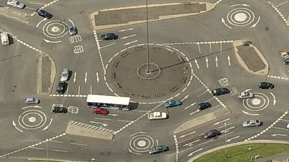 Zoals gebruikelijk in Groot-Brittannië rijdt het verkeer rond de minirotondes met de klok mee. Rond de grote, centrale rotonde mag je echter zowel met de klok mee als tegen de klok in rijden om de volgende minirotonde te bereiken. Door de verschillende rotondes draaien de voertuigen als raderen om elkaar heen.